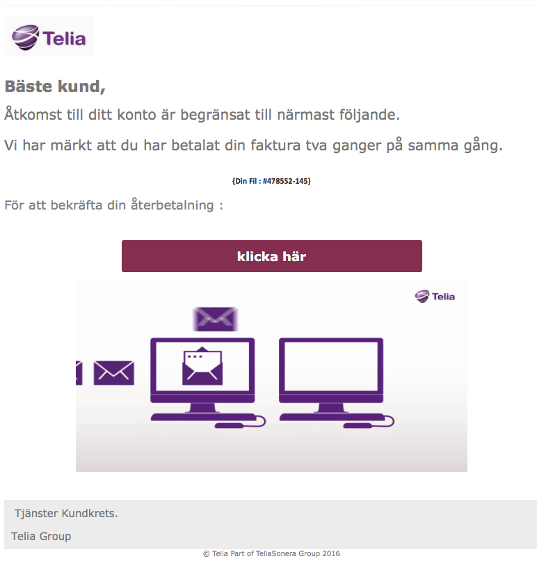 A new phishing mail that appears to come from Telia landed in my mailbox this morning. The spammers are often using Telia as bait, so we don’t warn for every new Telia spam that arrives. This one however, has a slightly different design compared to the others.