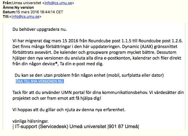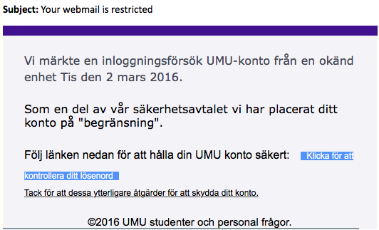Detta är ett phishing-mejl. Ge inte ut ditt användarnamn eller lösenord. Om du klickar på länken så kommer du till en sida som är en exakt kopia av UmU:s webmail, så låt dig inte luras.